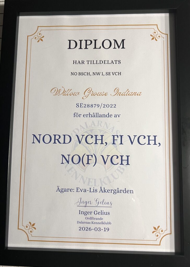 SSRK Dalarna har haft sitt årsmöte och Ellen tilldelades ett fint diplom och en fin ”Dalatupp” för sitt Nordiska Viltspårschampionat. 🐓📜 Vi har börjat vår spårsäsong och Ellen var riktigt glad när hon fick gå sitt första spår. Det var drag i linan och hon spårade fint. Ellen har även varit i Borlänge på inomhussök